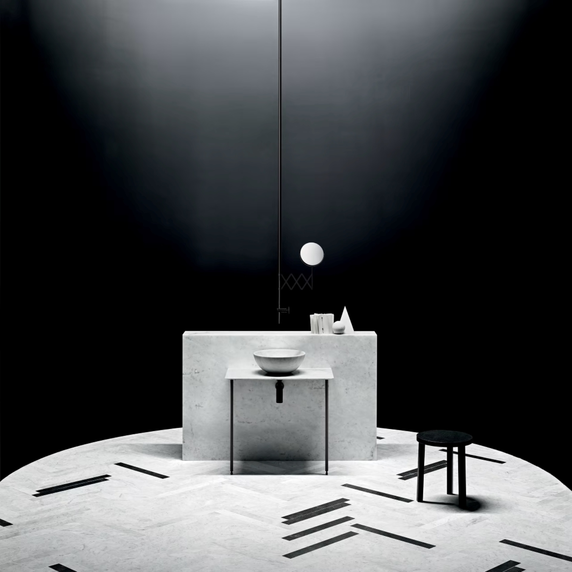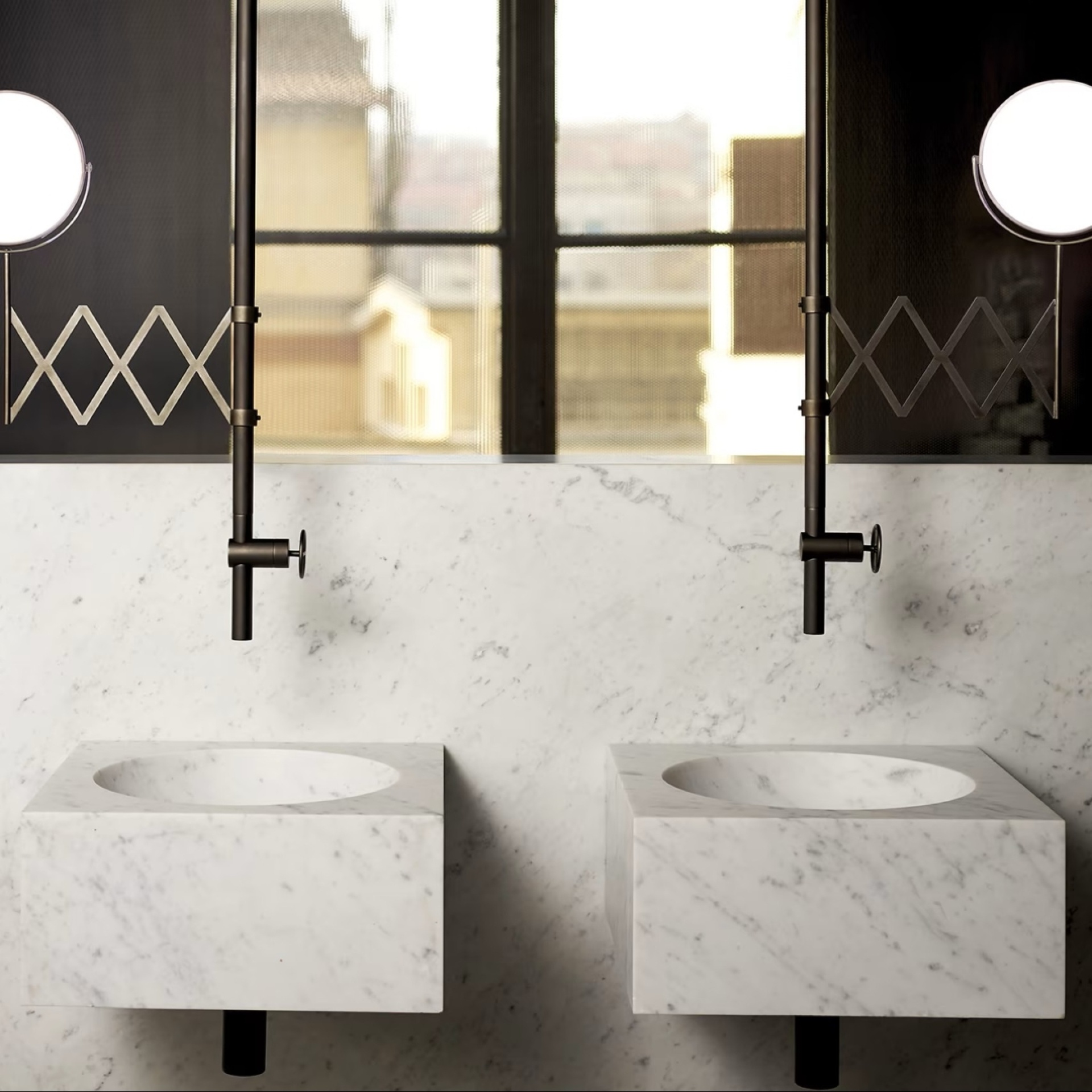 Fontane Bianche vznikla jako unikátní designový projekt založený na spolupráci dvou italských značek – Salvatori a Fantini. Centrálním motivem je dialog mezi kruhem a čtvercem – umyvadlo vzniká jako čtvercový blok přírodního kamene, z něhož je vyříznuta polokoule, která se stává samotnou mísou. Tento princip propojuje i baterie, kde radiální prvky navazují na tvarovou čistotu umyvadla.